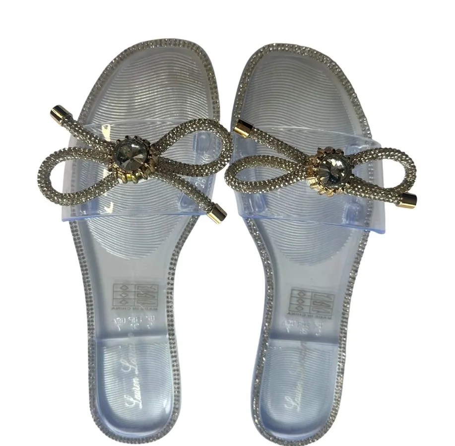 Brand new in box clear sandals with silver and gold rhinestone details. The box is damaged, but I re-assembled to ensure safety in transit. However, if keeping the box is important to you, this may not be suitable.