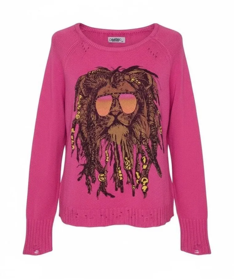 Novelty print sweater from Lauren Moshi Lightweight rayon knit Intentional distressing throughout Slouchy fit Iconic designer Lauren Moshi is famous for her edgy and quirky novelty prints This sweater is in great condition Designer Streetwear Edgy Punk Rasta Funky Fun Maximalist Eccentric