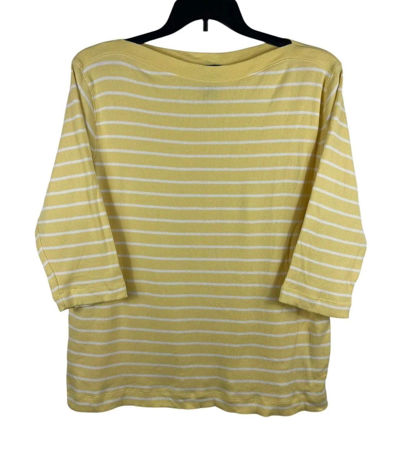 The Lauren Ralph Lauren 3X Yellow White Striped Cotton Knit Top with 3/4 sleeves and a boat neckline... Show more