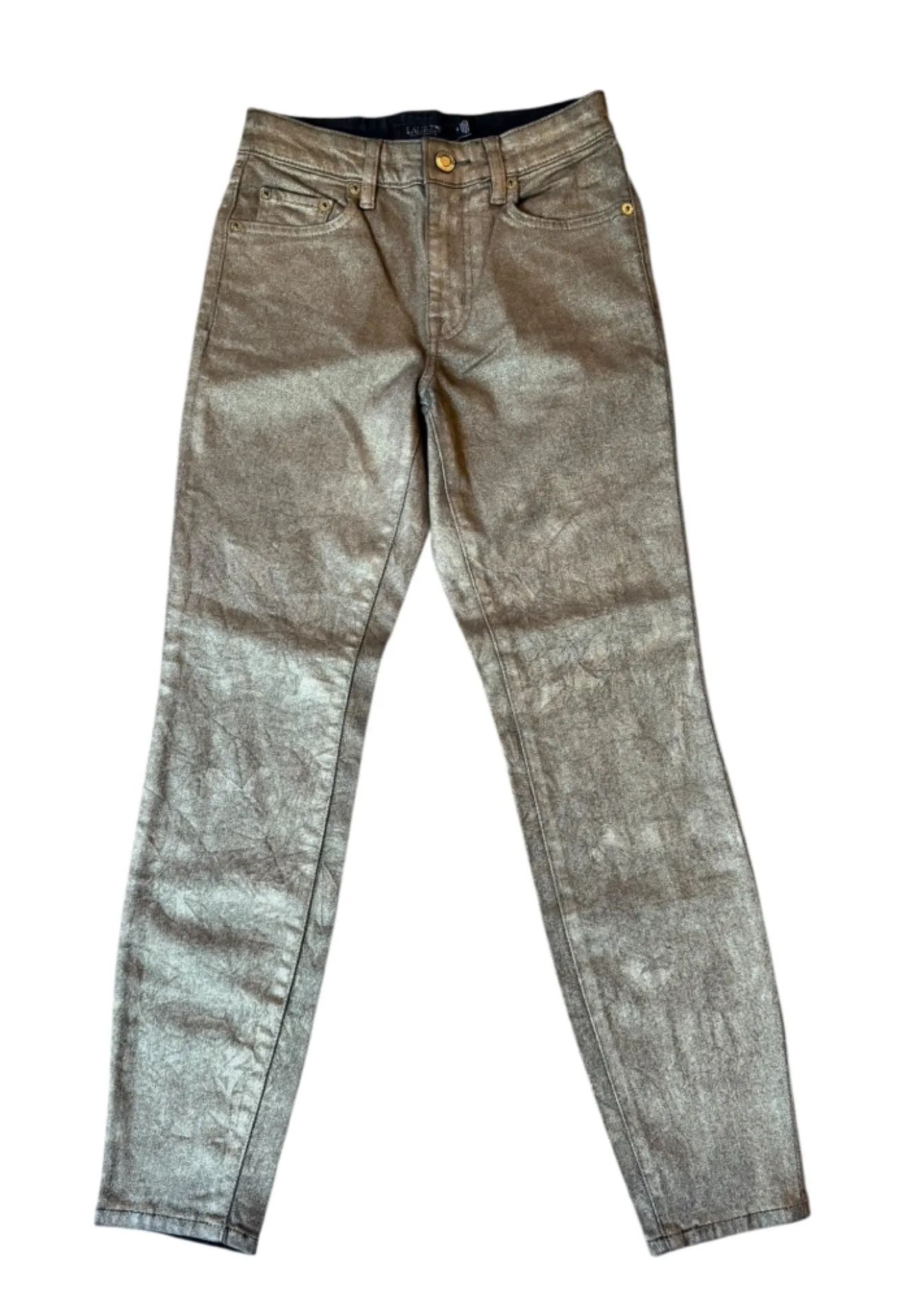 LAUREN Ralph Lauren Black Label Size 0 Measurements are Approximate Waist 12” Rise 9.5” Inseam 27” Sparkly Glitter Metallic Gold and Black Wax Denim Mid Rise Front + Back Pockets Zipper + Button Closure Intentional Distressed Look Luxury Quality Rigid Durable Skinny Jeans Cotton + Polyester + Elastane Preowned - minor signs of normal wear overall a little bit of wear to the button no major flaws