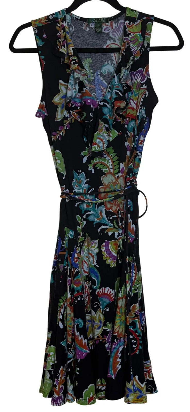 Keywords: Lauren Ralph Lauren dress, black maxi dress, paisley print dress, ruffle dress, sleeveless dress, V neck dress, belted dress, bohemian dress, summer dress, vacation dress, garden party dress, wedding guest dress, women's dress, size L dress