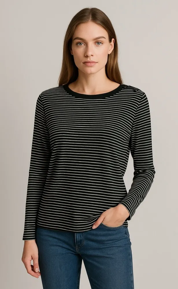 Classic and timeless, this Lauren Ralph Lauren women’s sweater in size L features black and white st... Show more