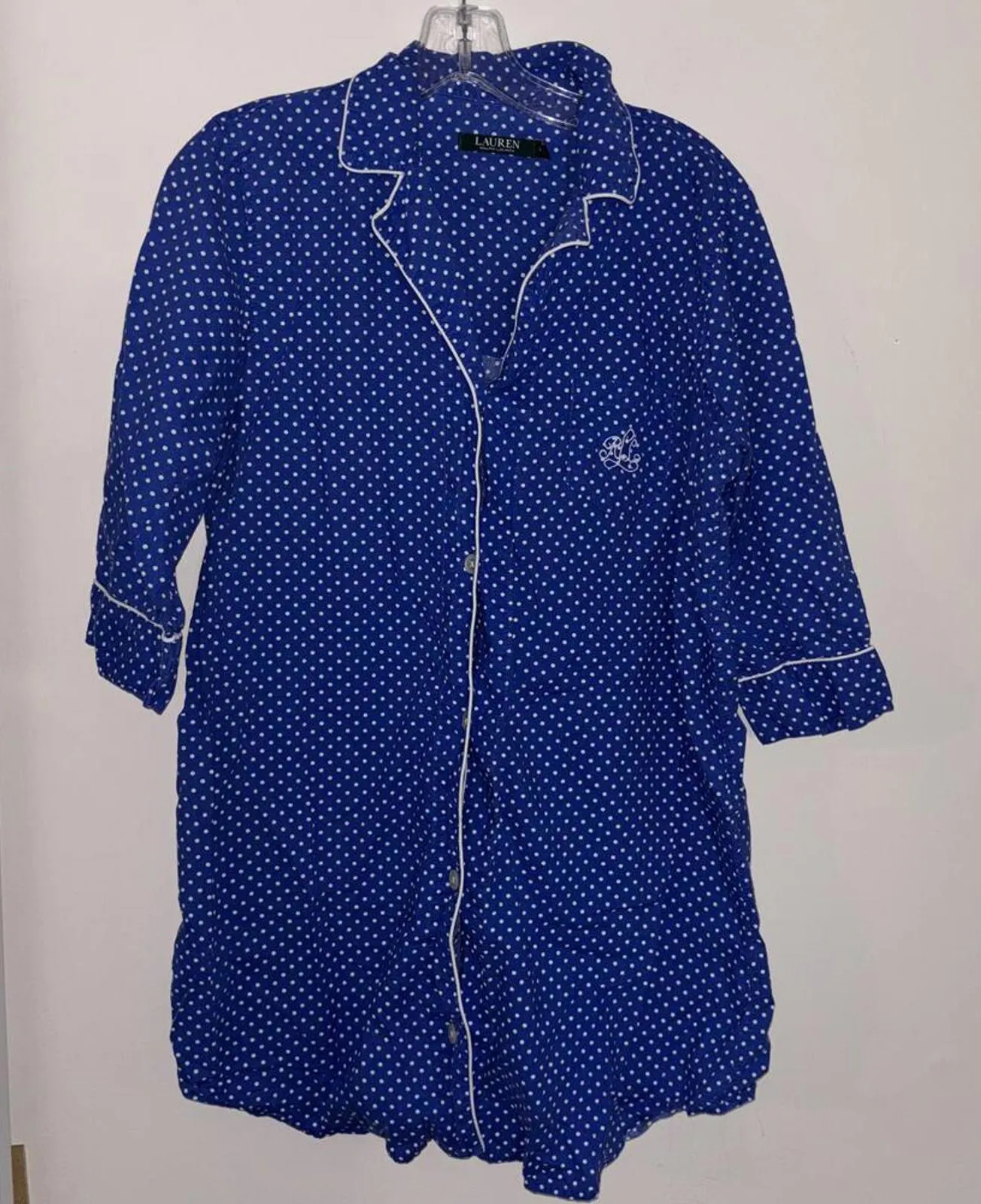 Lauren Ralph Lauren Brand. Blue and white polkadot nightgown, pajama top, sleep top, sleepwear, nigh... Show more