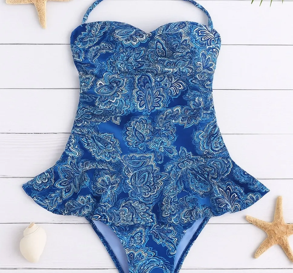 Make a splash in this timeless one-piece by Ralph Lauren, crafted in a vibrant blue paisley print. F... Show more