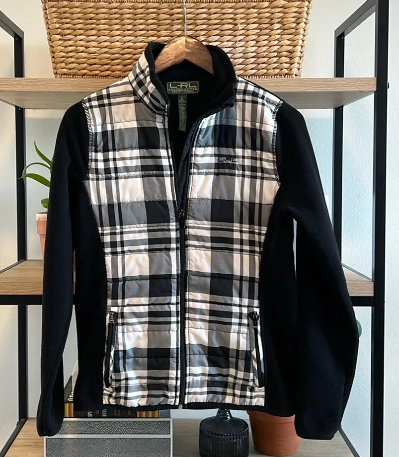 Good condition- no wear to note. Quilted buffalo paid front panel. Polar fleece sleeves & back. Full zip placket. Zippered functional pockets. "LRL" embroidery logo. Measurements taken flat: Length: 23.25" Pit to Pit: 18"