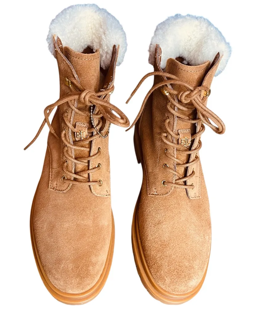 Lauren Ralph Lauren Carlee suede combat lace-up boots with faux-shearling lining and rubber lug sole size 8.5 New without box. Light scuffs from being in storage Signature style runs deep in the sophisticated laced profile and rugged lug soles of the Carlee booties from Lauren by Ralph Lauren. Features 3/4" heel Shaft height: 5"; Circumference: 10-1/4" Round-toe lace-up boots Gold-tone hardware and an polished "LRL" metal logo at the vamp attached to the laces Padded insole for added comfort Water resistant Tags: Lauren Ralph Lauren Carlee boots, LRL Carlee combat boots, tan suede boots, lace-up ankle boots, lug sole boots, designer combat boots,women’s fall boots, neutral suede booties, rugged chic style, luxury casual boots, moto-inspired boots, Ralph Lauren footwear, neutral