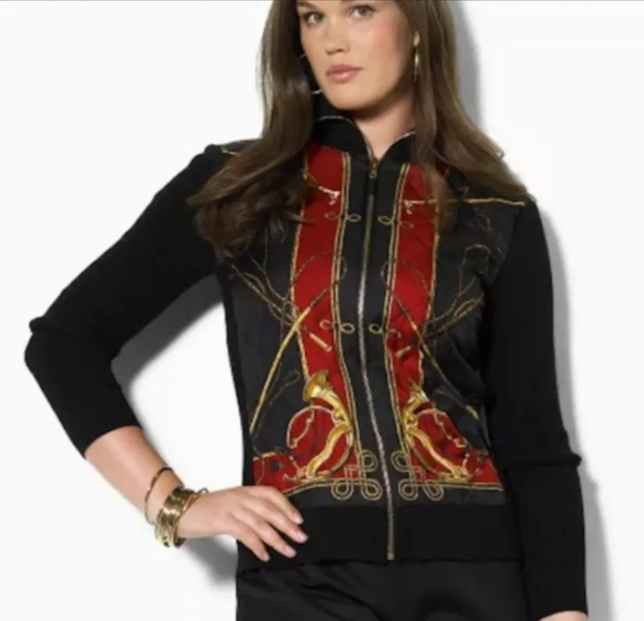 Lauren Ralph Lauren Equestrian Bishop zipper sweater cardigan. Features a black base with bold red a... Show more