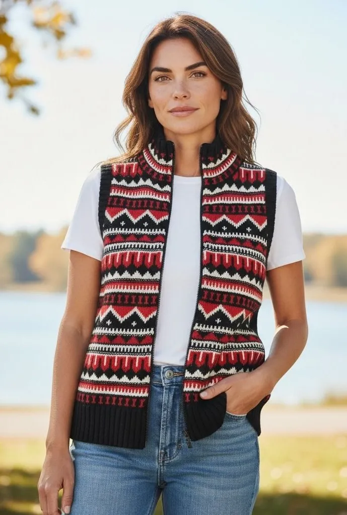 Embrace cozy mountain chic with this striking Lauren Ralph Lauren vest. The bold red, black, and white Fair Isle pattern, a timeless symbol of rustic elegance, brings a touch of après-ski charm to any outfit. Crafted for comfort and style, this sleeveless layer features a flattering stand-up collar and a smooth full-zip front, perfect for adding warmth without bulk. Layer it over a crisp white tee for a casual weekend look or pair it with a long-sleeve top for a touch of refined warmth during a brisk autumn stroll or a cozy evening by the fire.
