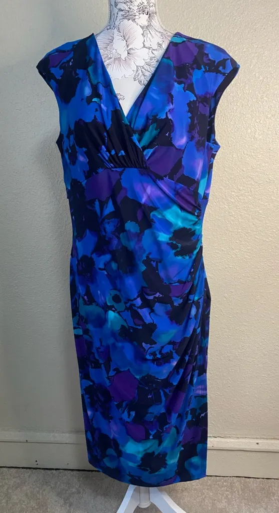 This beautiful blue floral print dress is a faux wrap design with a deep V neck and rouching to hide... Show more