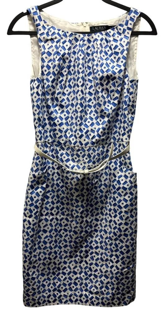 Stylish sheath dress featuring a geometric blue pattern on white fabric, perfect for adding a touch... Show more
