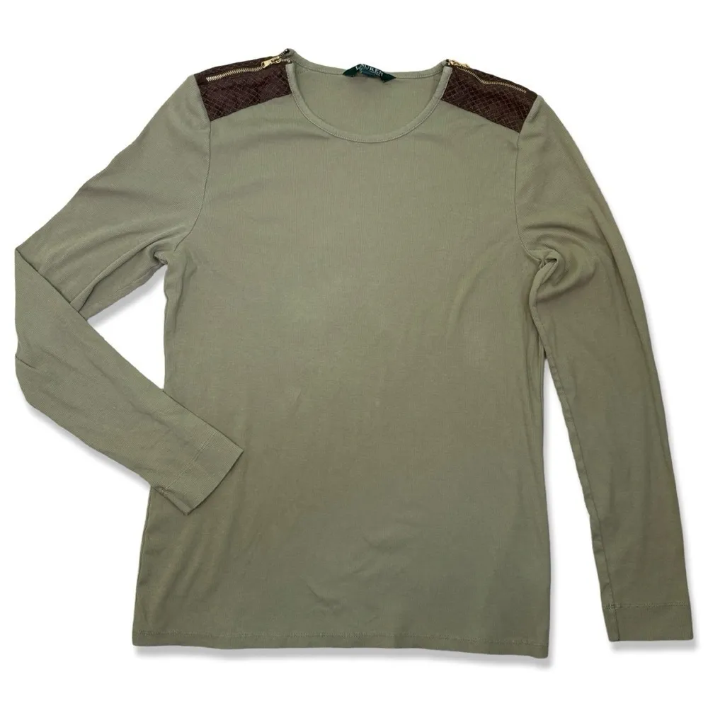 LRL Ralph Lauren Knit Tee Shirt Ribbed Brown Faux Suede Lace Shoulder Patch Army green color with... Show more