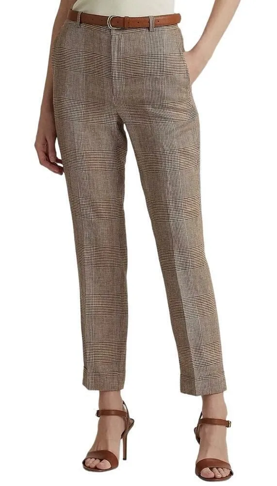 An elevated wardrobe essential, Lauren Ralph Lauren's stylish ankle pant is updated for the season with a lightweight linen construction. Crisp pleats and the season's Glen plaid motif enhance its sophisticated character. Approx. inseam: 28"; 10-1/4" rise Mid-rise Straight fit Intended to hit at the ankle Belt loops Zip fly with a buttoned closure Signature horn-effect buttons Two front waist angled pockets Two back waist welt pockets Creases run down the front and back of each leg Back waist darts Rolled cuffs New with tags. In excellent condition. Original price $175.00.