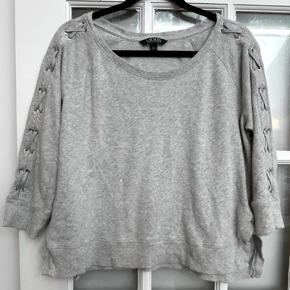 Chic gray pullover with stylish lace-up sleeves. Ideal for everyday wear. Great, preowned conditi... Show more