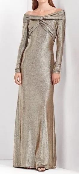 Lauren Ralph Lauren Off‑The‑Shoulder Metallic Gown Size 10 · Gold · NWT This stretch knit gown show... Show more