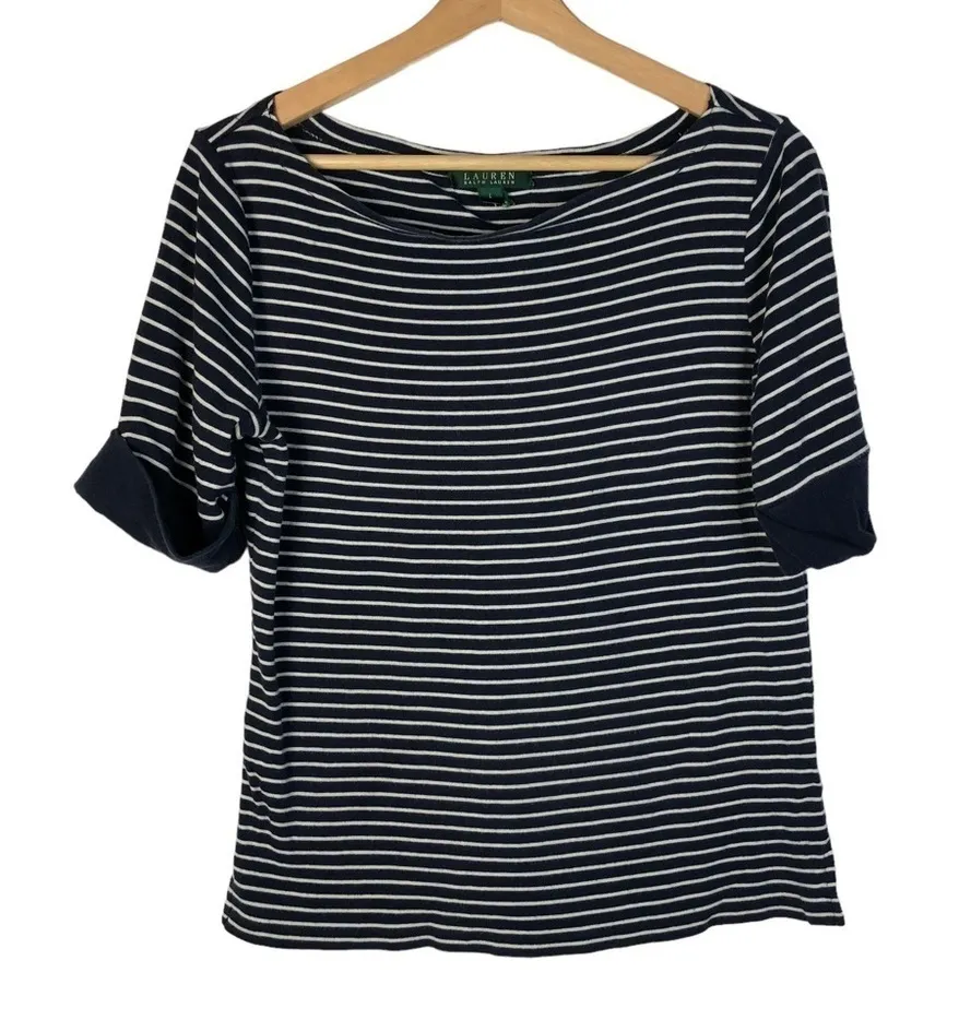 Lauren Ralph Lauren Navy Blue & White Stripe Boat Neck Top Good used condition, minimal signs of we... Show more