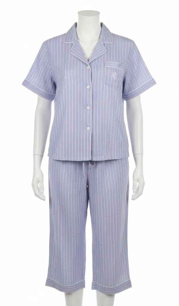 Pajama Set, PJ Set, Sleep Set, Lounge Set, Capris, Cropped Pants, Cap Sleeve Top, Button-Up Shirt, Sleep Shirt, Loungewear, Ralph Lauren, Lauren, Drawstring Waist, Monogram, Pocket Logo, Contrast Piping, Nautical, Preppy, Classic, Coastal, Cottagecore, Cozy, Soft, Vintage Inspired, Pin Stripe, Thin Stripe, Blue, White, Coral, Pink, All Seasons