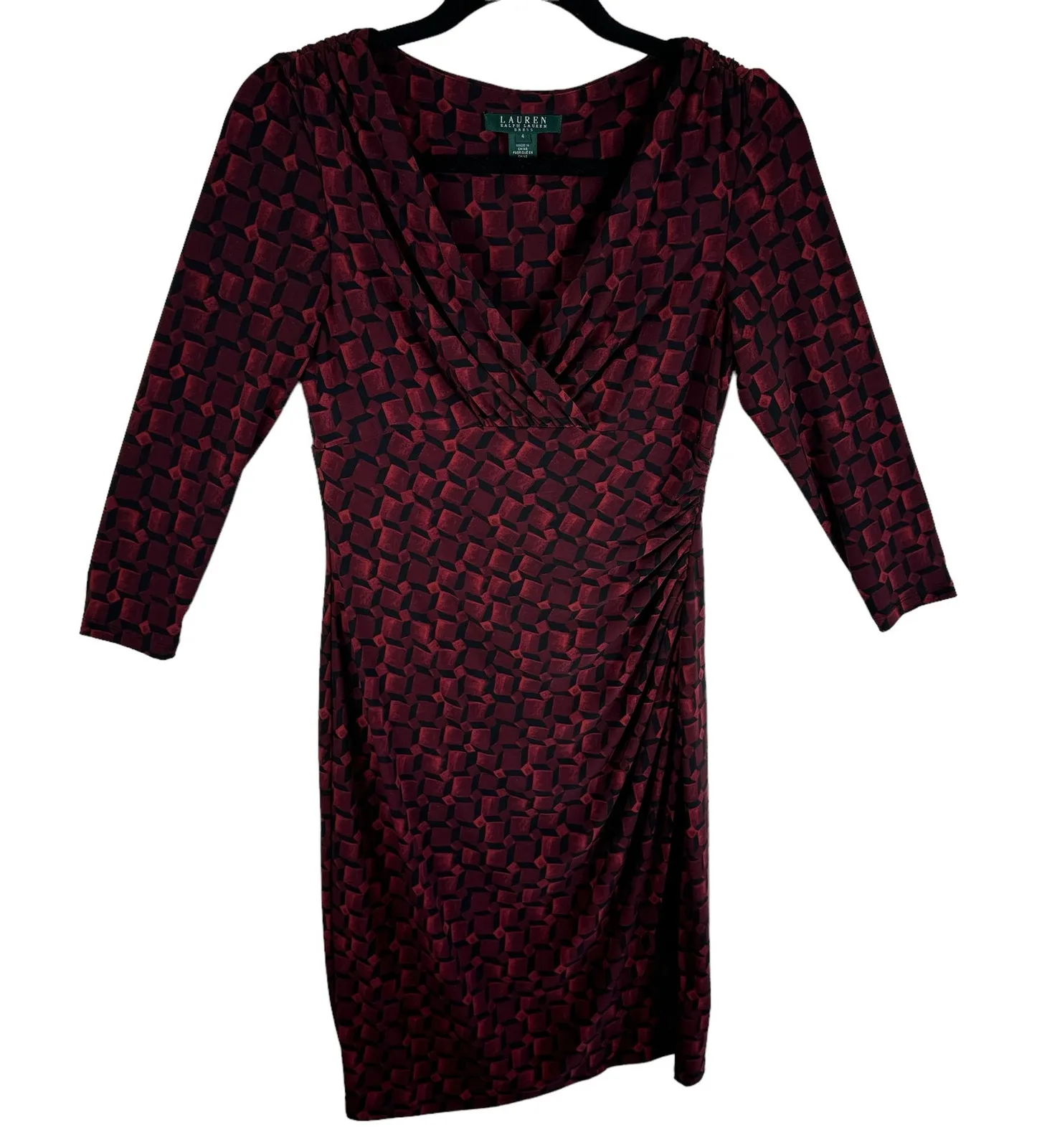 Excellent preowned condition. Red & black 3/4 sleeve faux wrap V-Neck pullover stretchy jersey knit... Show more