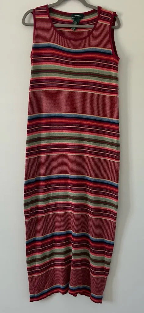 Lauren Ralph Lauren Red Blue Striped Sleeveless Linen Cotton Knit Maxi Dress Size Large Color Red... Show more