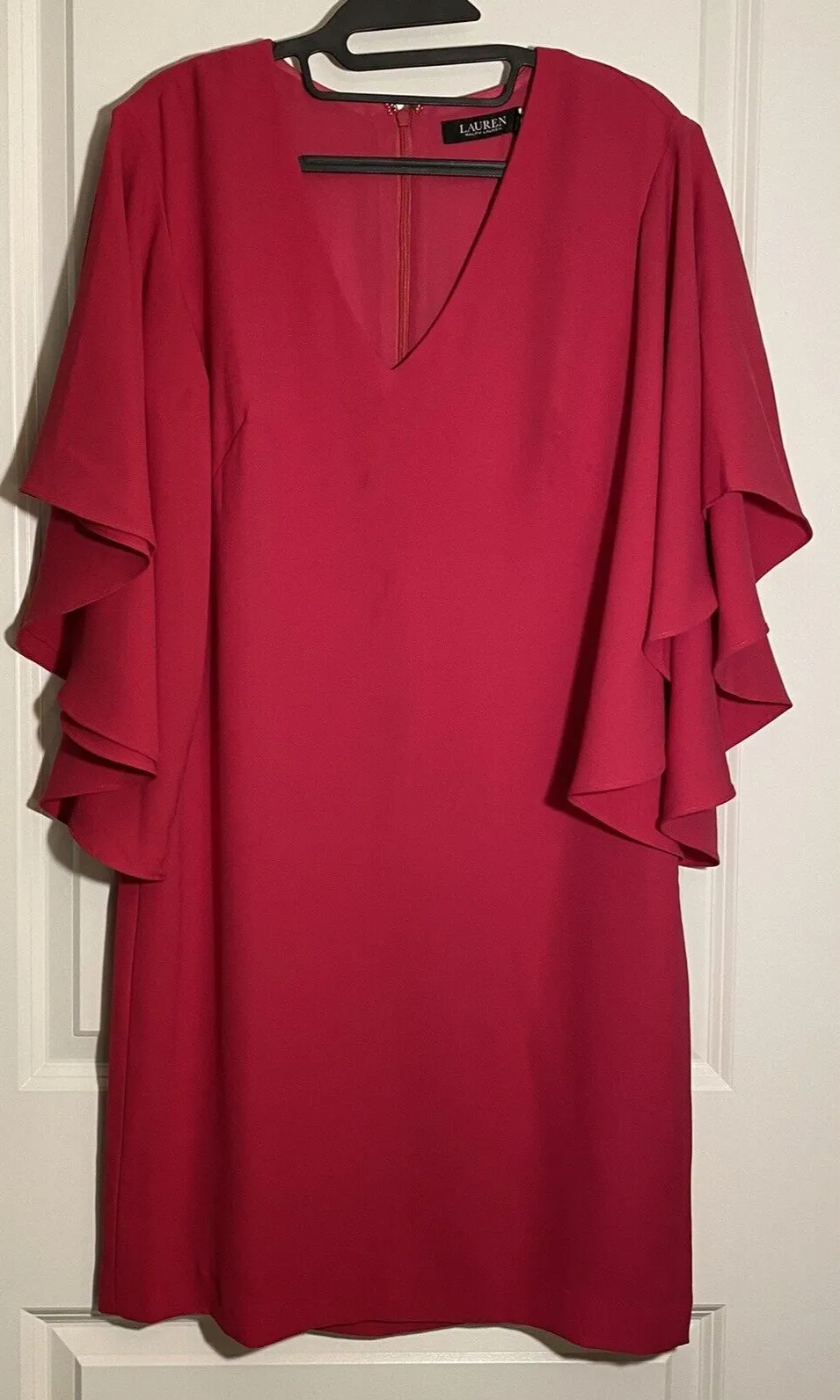 Keywords: Lauren Ralph Lauren dress, red dress, V neck dress, tiered sleeve dress, flutter sleeve dr... Show more