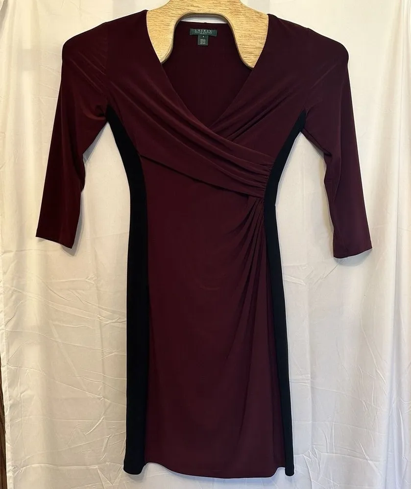 Lauren Ralph Lauren Size 6 Maroon Black Long Sleeve Faux Wrap Midi Dress Stretch - $24 - From HannahBThrifts
