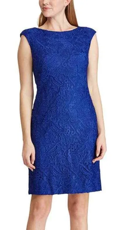 Lauren Ralph Lauren Stretch Lace Shift Dress Boatneck Cap Sleeve royal blue 2. Zipper back. Good con... Show more
