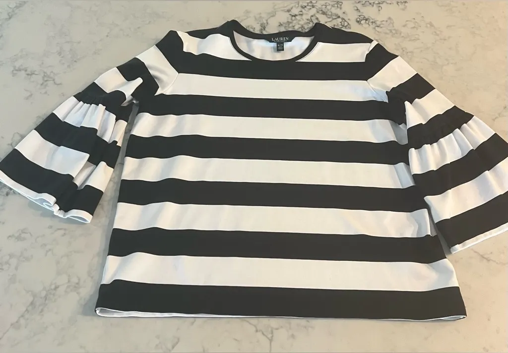 Lauren Ralph Lauren Striped Bell Sleeve Knit Top Black White Size XL Excellent condition. The... Show more