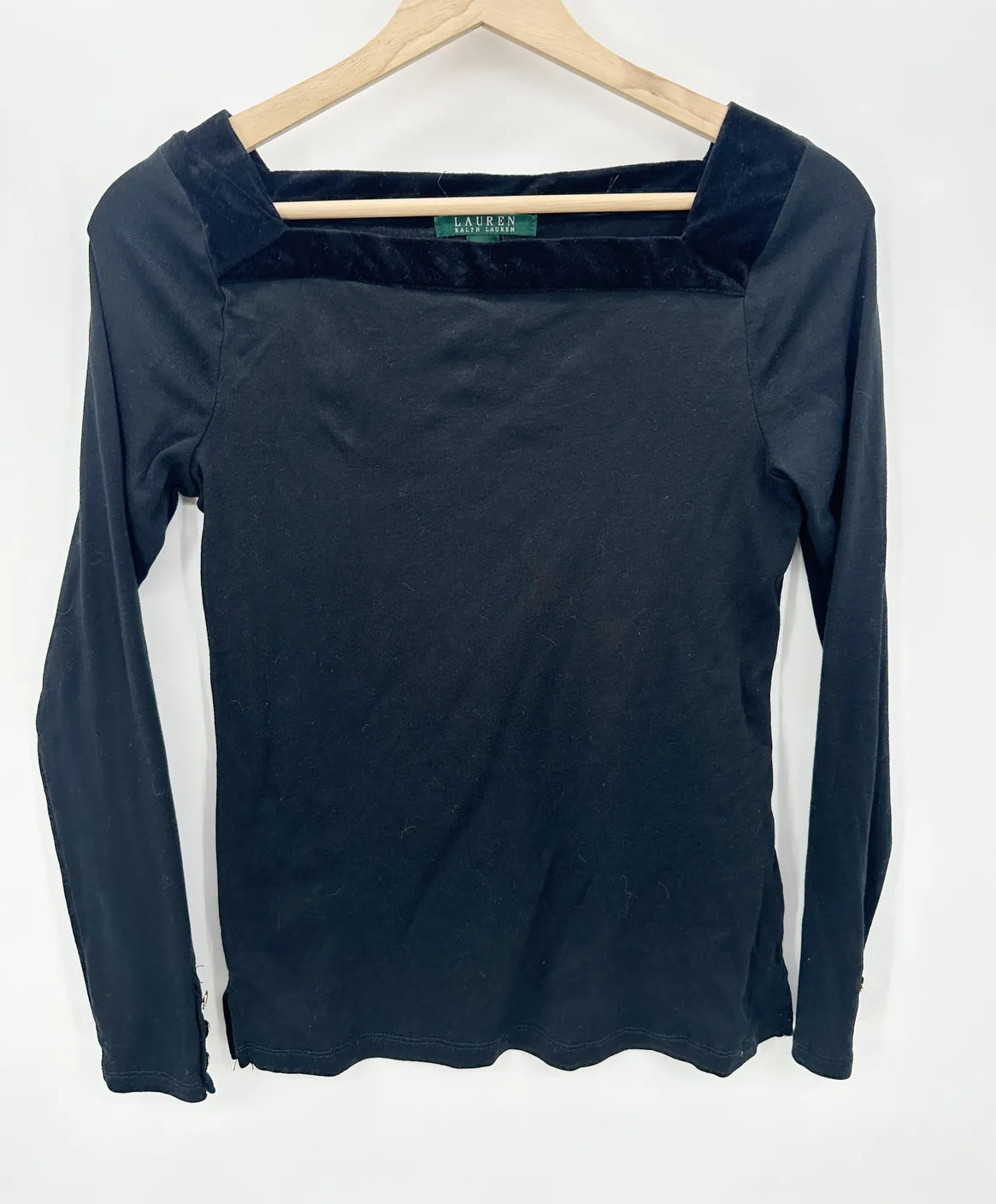 Lauren Ralph Lauren Women Black Velvet Trim Long Sleeve Shirt Square Neckline. Button Detail at wris... Show more