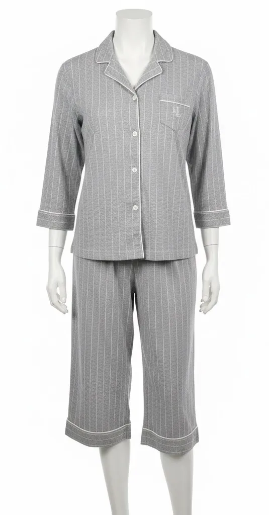 Black Label, Pajama Set, Sleepwear, Loungewear, Pinstripe, Pinstriped, Striped, Gray, Grey, White Piping, Collared Shirt, Button Front, 3/4 Sleeve, Cropped Pants, Capri, Drawstring, Comfy, Cozy, Soft, Prep, Preppy, Classic, Traditional, Chic, Minimalist, Capsule Wardrobe, Travel, Hotel, Quiet Luxury