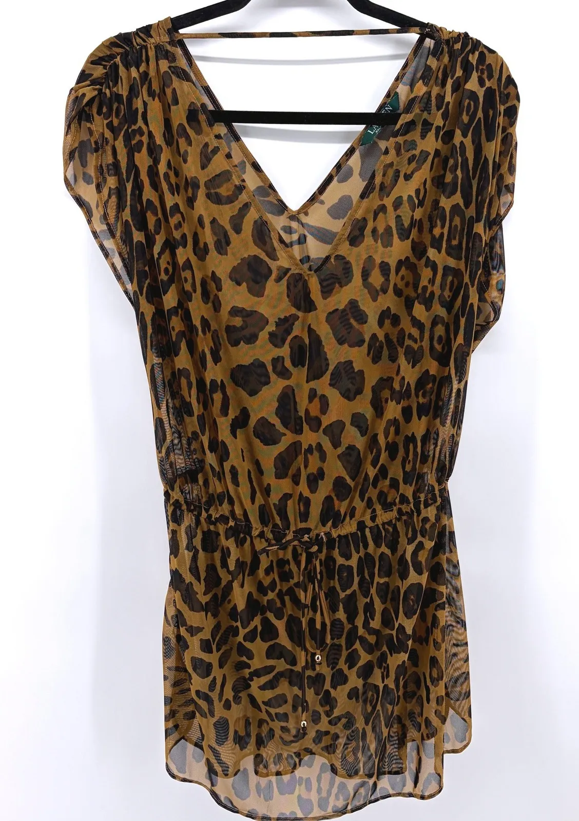 Keywords: leopard print, mesh, tunic, swim cover up, kaftan, sheer, drawstring waist, beachwear, resort wear, designer, vacation, bohemian, animal print