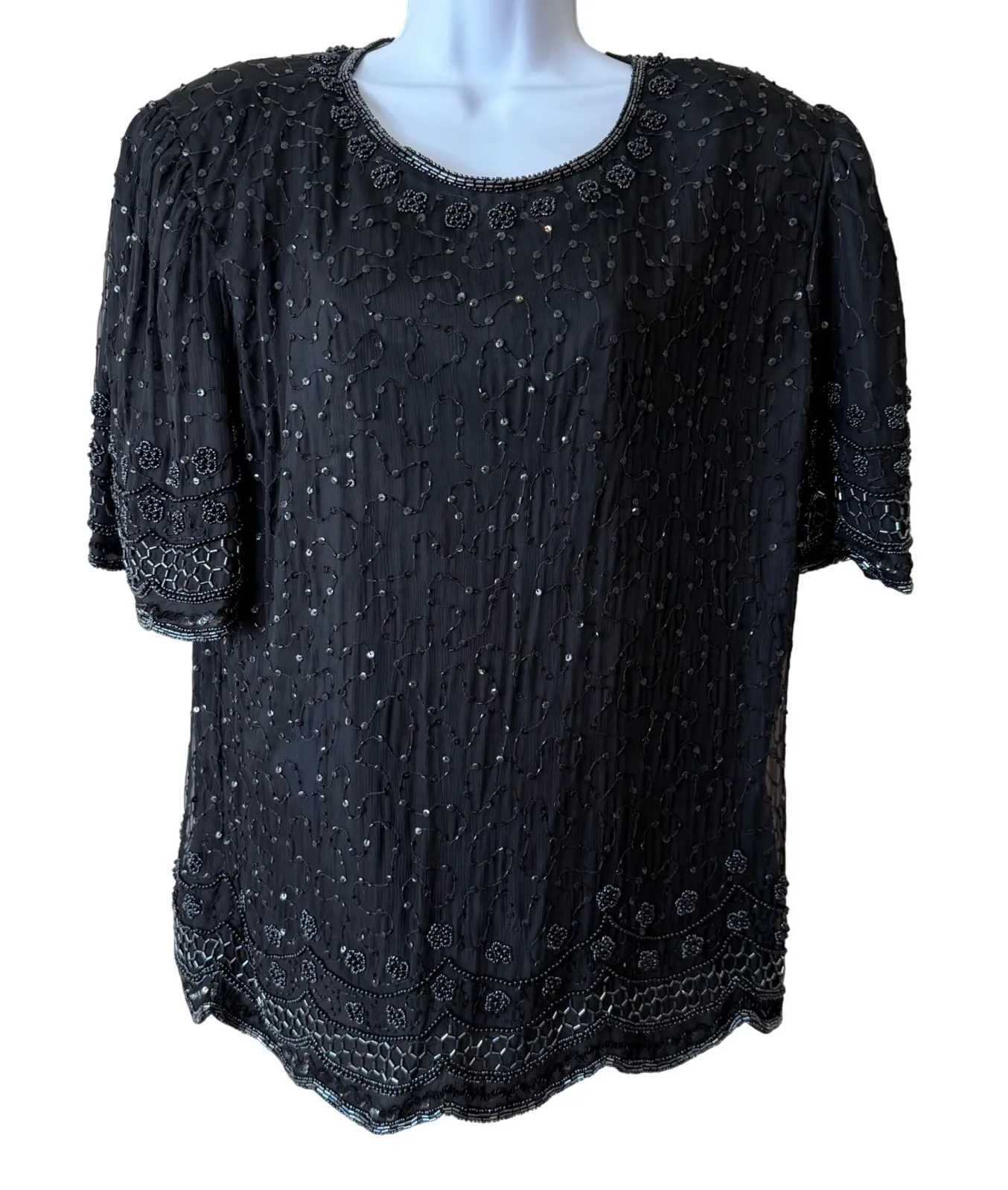Command the spotlight in this extraordinary vintage Laurence Kazar New York top, a dazzling display of artistry and elegance. This timeless blouse features intricate beadwork and shimmering sequins meticulously hand-sewn onto a delicate silk shell. The rounded neckline and short sleeves add to the sophistication, while the scalloped hemline provides a touch of whimsy. Imagine making a grand entrance at a glamorous cocktail party, a special anniversary dinner, or even a chic gallery opening, all eyes drawn to your unique style and the shimmering allure of this unforgettable garment. Decade: 1980s Look: Eveningwear Size (Women's): 1X Material: 100% Silk Color: Black Style: Shirt Keywords: Laurence Kazar, vintage top, beaded top, sequined top, cocktail blouse, party top, statement top, silk top, black blouse, plus size top, 1X, formal top, special occasion, designer blouse, vintage blouse