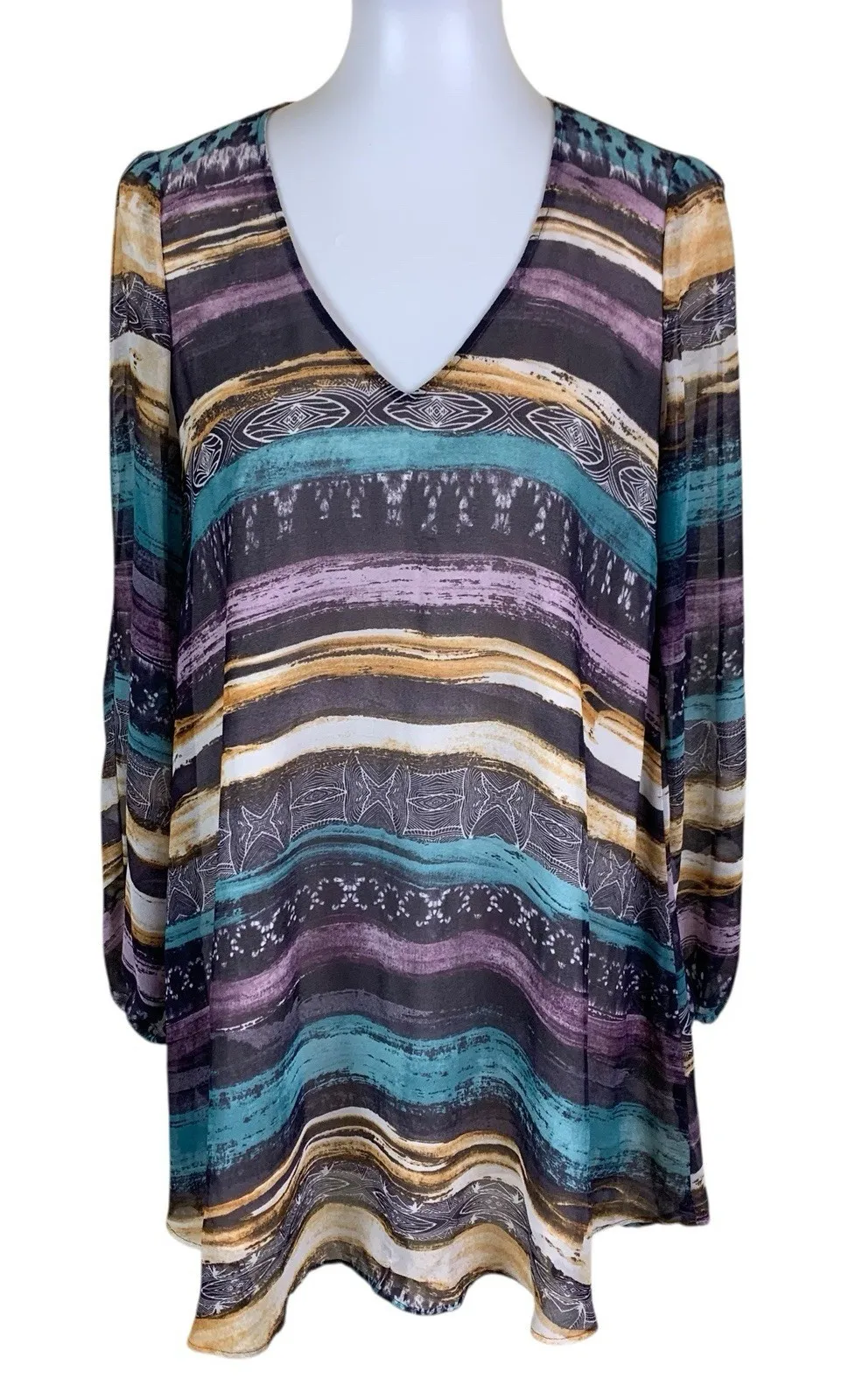 Lavender Brown Abstract Stripe Swing Dress V Neck Long Sleeve Boho XS - $45 - From Rodica