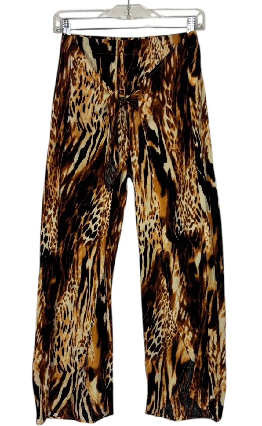 Bold and flowy Lavender Sky animal-print pants featuring dramatic open split legs, a soft rayon drape, and wide-leg silhouette. These give that effortless boho, festival, or resort-vacation vibe — lightweight, airy, and made to move with you. Elastic waistband with self-tie for flexible fit. Perfect for concerts, summer trips, poolside outfits, or standout everyday styling. Waist: 16" stretches to 20" Rise:12" Inseam: 30" Excellent pre-owned condition. No flaws noted. boho, festival, gypsy, jungle print, leopard print, Y2K, retro, Coachella style, beach pants, resortwear, flowy pants, lounge pants, dramatic leg slit pants, summer outfit, bold print Smoke-free, pet-free home. All items are washed/sanitized with hypoallergenic detergent and come ready to be worn! All measurements taken with item laying flat. Length is measured from shoulder to bottom hem. Bundle and save — check out my closet for more styles!