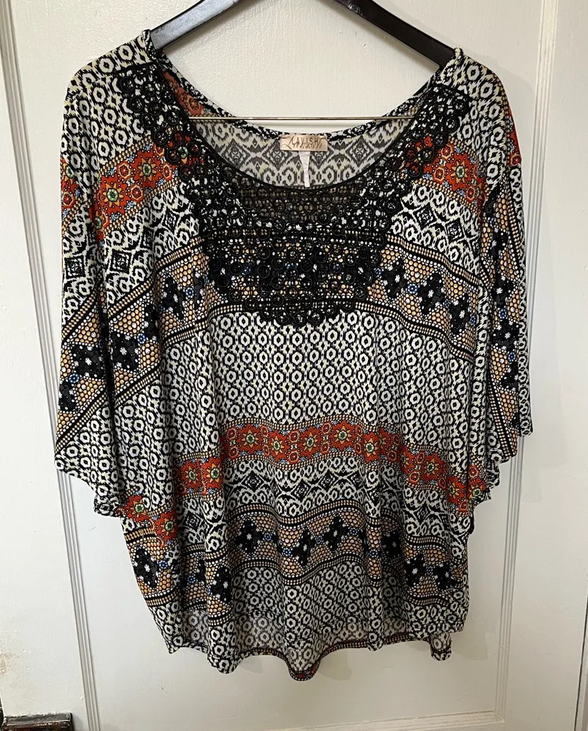 This chic blouse by Lavish features a striking graphic design in black and orange, complemented by dolman sleeves for a relaxed and comfortable fit. The embellished details enhance its stylish appeal, making it perfect for casual occasions.