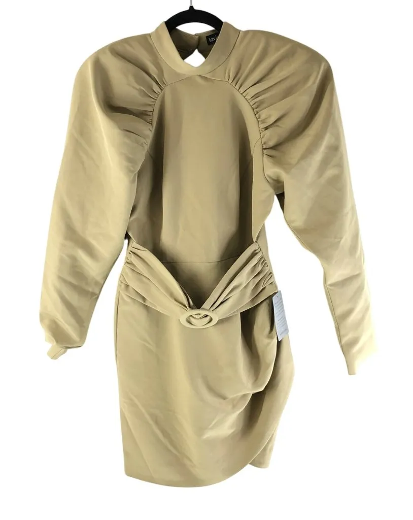 Lavish Alice High Neck Pleated Raglan Mini Dress Open Back Belted Beige 6 Tan - $76 - From Jen