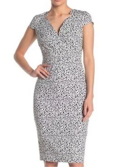 Cap sleeve sheath dress. Midi length, back zip, notched v neckline, variegated polka dots. Beautiful... Show more
