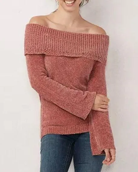LC Lauren Conrad Burnt Orange Off-the-Shoulder Chenille Sweater with Cozy Chenille Construction and... Show more