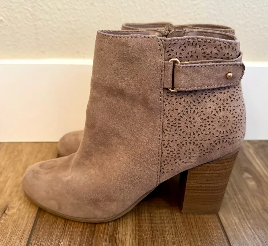 Elegant taupe booties with a stylish perforated design. Features a sturdy block heel and side buckle... Show more