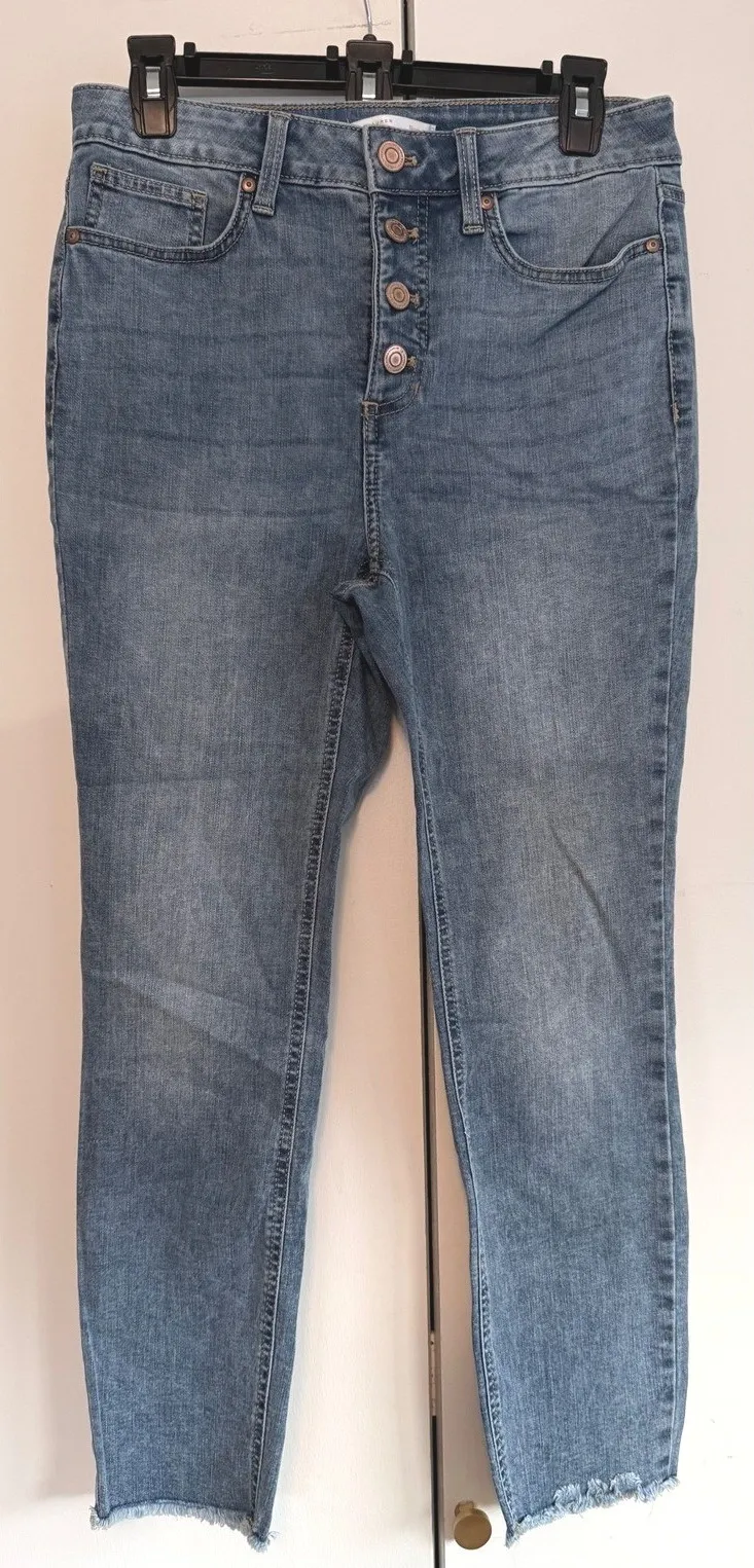 Keywords: LC Lauren Conrad Jeans, Women's Skinny Jeans, High Rise Jeans, Button Fly Jeans, Raw Hem Jeans, Ankle Jeans, Blue Denim, Casual Denim, Everyday Jeans, Stretch Jeans, Comfortable Jeans, Fashion Denim, Distressed Hem Jeans, Y2K/90s Revival, Coastal Cowgirl, Casual Chic, Grunge Chic