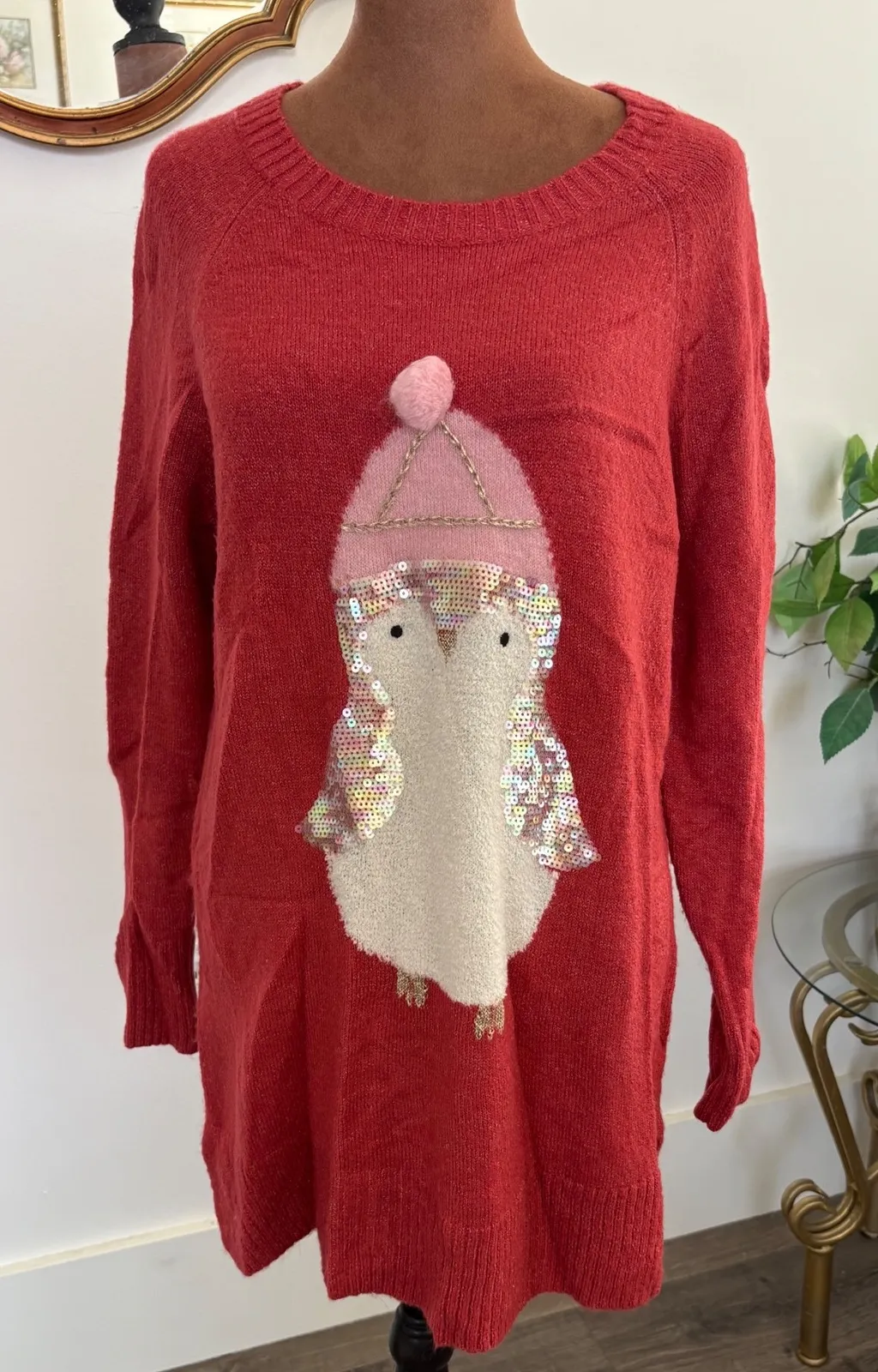 Ignite the holiday spirit with this charming sweater dress. A festive statement piece, this red sweater dress features a playful penguin adorned with sequins and a pompom hat, adding a touch of whimsy to your wardrobe. The vibrant red color evokes a sense of warmth and cheer, while the long sleeves provide a cozy feel. Perfect for adding a festive, comfortable, and fashionable look to any winter ensemble. Style it for a cozy family gathering, a festive office party, or a casual holiday outing.