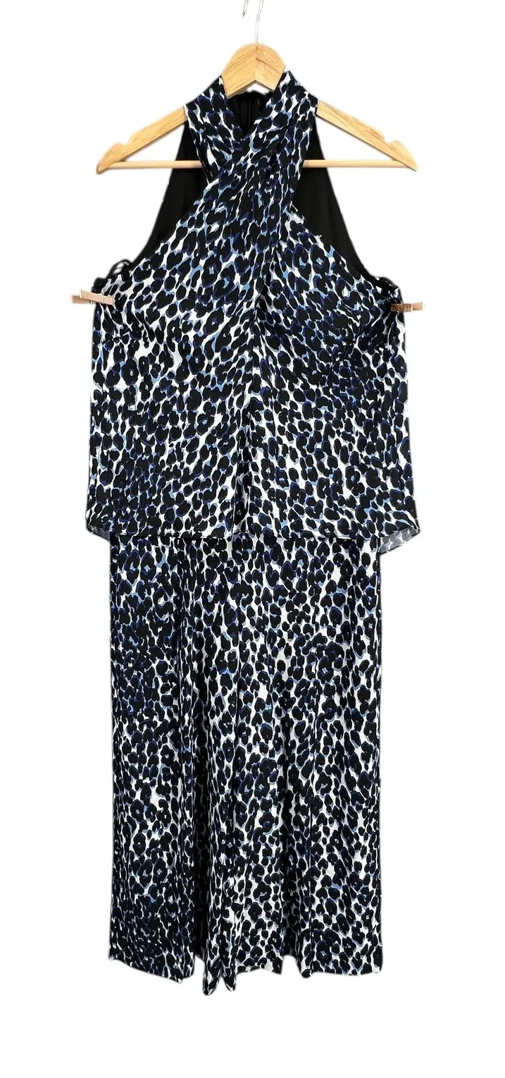 Standout designer piece by Le Gali. This is the "Hildy" jumpsuit in the Deep Sea Multi print — a modern, flowy silhouette featuring a criss-cross halter neckline, popover top, and side-slit wide legs. It has a hidden back zipper, full lining from shoulder to knee, and an open slit at the upper back. The fabric feels like a woven polyester blend with no stretch. Measurements (flat): Armpit to armpit: 19 inches Waist: 15.5 inches Shoulder to hem: 52 inches Inseam: 22 inches Condition: New with tags. Keywords: LE GALI, jumpsuit, leopard print, halter neck, wide leg, blue, black, white, statement piece, evening wear, cocktail, fashion, elegant, chic, womenswear