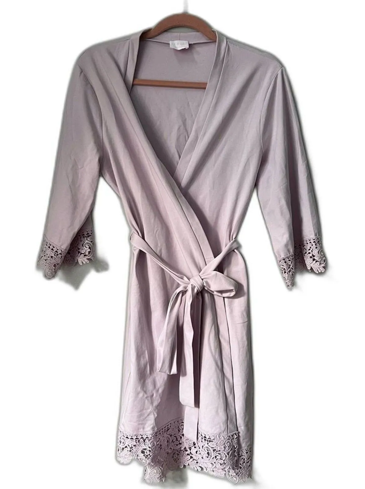 Made from a premium cotton luxe matt satin with just the right amount of stretch that makes this robe super comfortable. The sleeve and hem is adorned with delicate lace detailing. The robe includes both and internal tie and detachable outer waist tie Fabric Composition: 95% Polyester/5% Elastane It is the robe you have been waiting for. Adorned by touches of timeless oh so delicate lace it is the robe your entire bridal party will wear long after the bouquet is thrown.