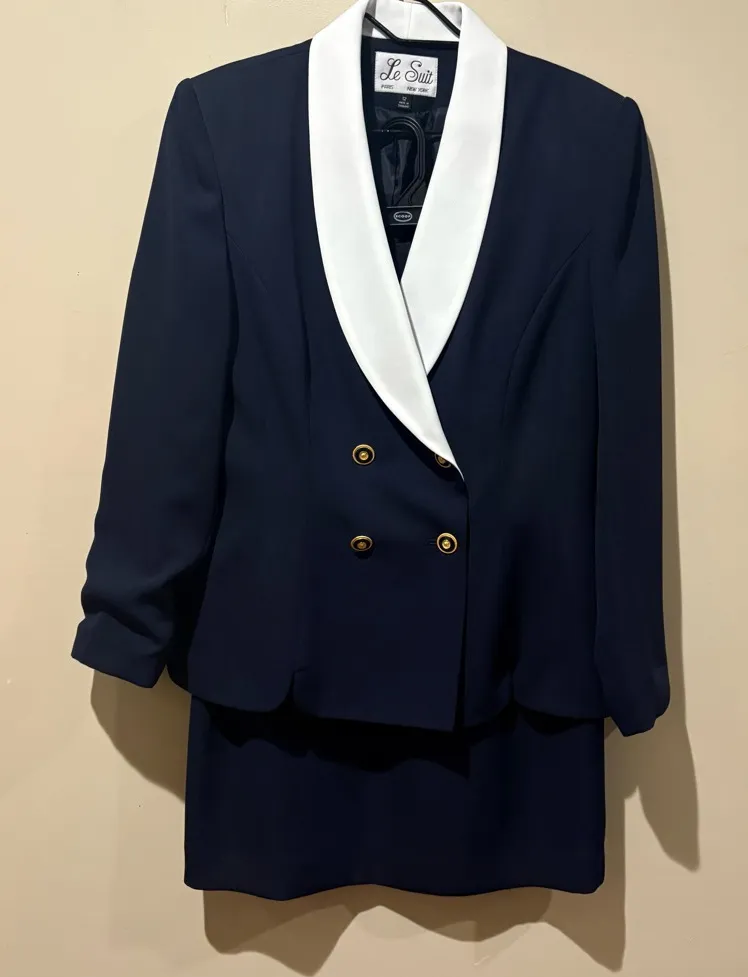 Chic navy blazer with a bold white lapel. Features elegant gold buttons. Ideal for professional settings. Good used condition Crepe fabric 100% polyester Pleated front skirt ,lined,back zipper