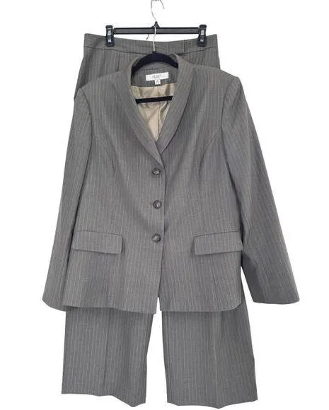 A timeless and professional pinstripe suit set, perfect for office wear, interviews, or formal occasions. This Le Suit two-piece ensemble features a tailored blazer with a notched collar, three-button closure, and flap pockets, paired with matching straight-leg trousers. • Size: 18 Approximate measurements — not exact Blazer: Pit of o Pit 22” Length 26” Sleeve length 24” Shoulder to shoulder 18” Pants Waist 19.5” Raise 12” Inseam 29 Length 41” • Color: Charcoal gray with subtle pinstripes • Includes: Blazer and matching pants • RN: 54050 • Blazer: Fully lined with button front and structured seams for a flattering fit • Pants: Flat front with classic straight-leg silhouette Condition: Excellent pre-owned Fast Shipping Offer Welcome Bundle discount