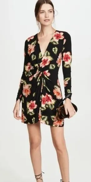 Le Superbe Waikiki Mini Baller Floral Print Long Sleeve V-Neck Dress Size XS Exotic floral dress in a bodycon silhouette with twist knot detail at waist offers a contemporary cocktail option for the season. * Deep V-neck * Long sleeves * Pullover style * Twist ruching detail * Stretch lining 15582