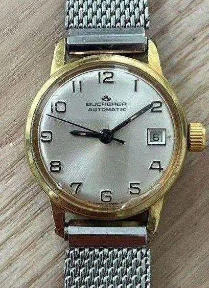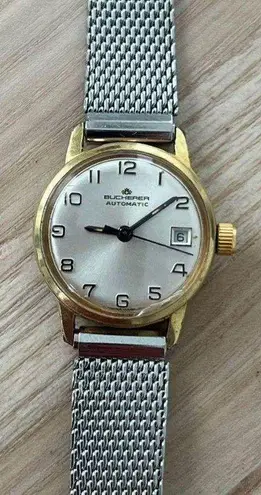 Brand: Bucherer Model: Automatic Gender: Ladies Description: Rare luxury vintage automatic winding watch. 20 microns gold plated case. Stainless dial with date window. Black and luminous markers and hands. Brand new weave stainless steel adjustable bracelet. Swiss made watch. Just cleaned and serviced. Works well! Condition: Great. New bracelet. Small crack on crystal doesn’t impact water resistance. Works well! Band/Bracelet Type: Stretch Stainless Date Window?: Yes Power Type?: Automatic New Fresh Battery Installed?: N/A, no batteries Box?: No Additional Links?: No Notes: Please see pictures for condition and measurements. Mechanical watches are shipped in good working order, unless otherwise stated. However, due to different shipping practices with USPS, they may pick up magnetization and may require additional servicing to run properly once received. From a smoke free, pet free home. Condition Notes: -NWOT: New Without Tags. Brand new item. May have super light handling marks, if any. -Like New: Extremely minor handling or wear marks, if any. Item may have been worn once or twice -Excellent: Minor, but more noticeable light wear marks on band, case, and/or very light scratches on crystal, if any. -Great: Above average condition for the age of the watch. Light to moderate surface wear or scratches -Good: Expected wear marks for typical standard use for the age of the watch. Noticeable surface scratches on band, case, and/or crystal -Other: Will be described if applicable