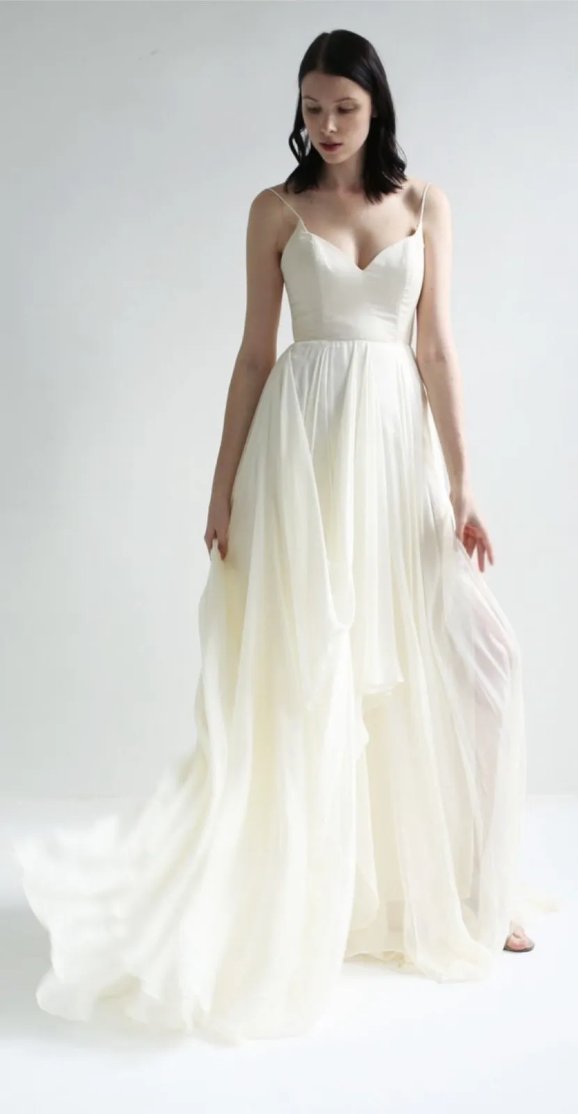 Designer: Leanne Marshall Style: Faye Gown Size: 12 (U.S.) Color: Ivory Bodice: Structured V-neck with light boning for support Skirt: Flowing asymmetrical silk chiffon with layered drape Back: Low open V-back with hidden zipper closure Retail: $2,750 USD Boutique: Meg Guess Couture (Oklahoma City) Handmade luxury gown; sample version not worn Materials 100% Silk Chiffon Outer Fully Lined Silk Bodice Professionally tailored finish Leanne Marshall | Faye gown | silk chiffon | ivory wedding dress | NWT bridal | designer gown | A-line | V-neck | open back | flowy train | Meg Guess Couture | romantic bridal | luxury wedding dress | handmade silk | bohemian bride | modern classic I ship out items Monday-Friday. • All items come from a pet-free, smoke-free home. • Please compare the measurements to something you already own. Thank you for visiting my store.