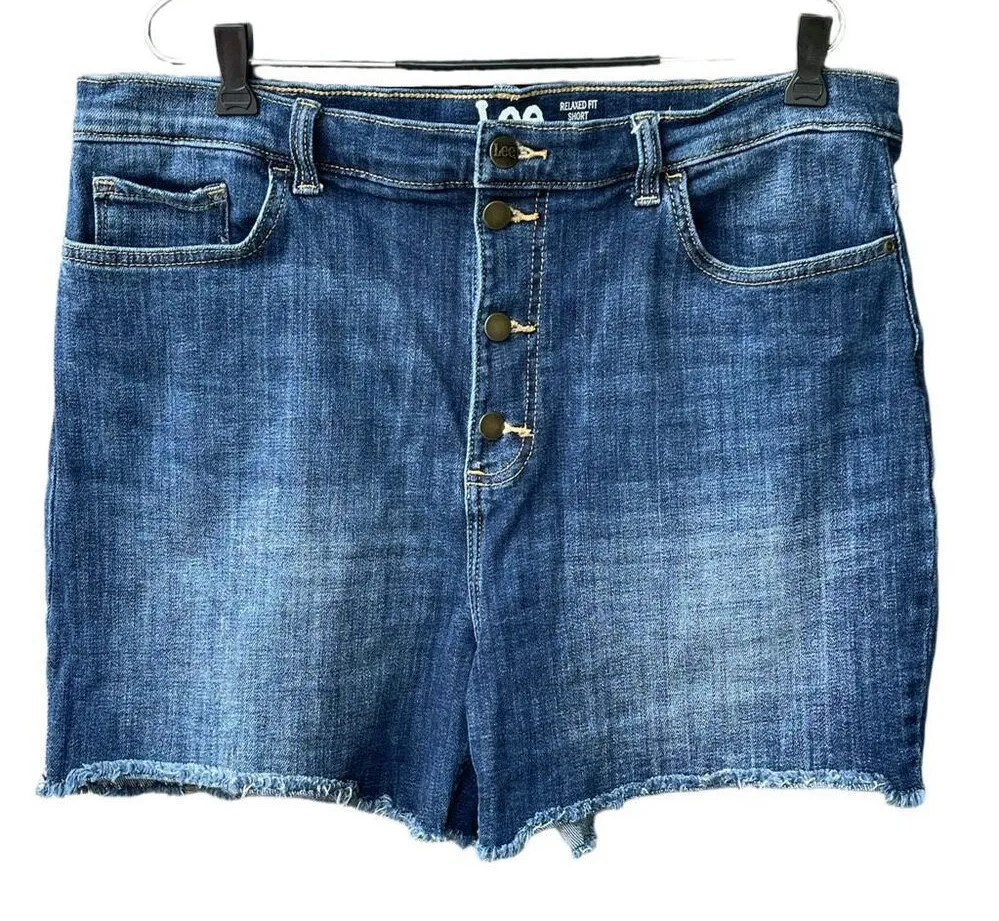 Lee Heritage size 20 high rise relaxed fit frayed hem denim shorts. 99% cotton 1% spandex. Button f... Show more