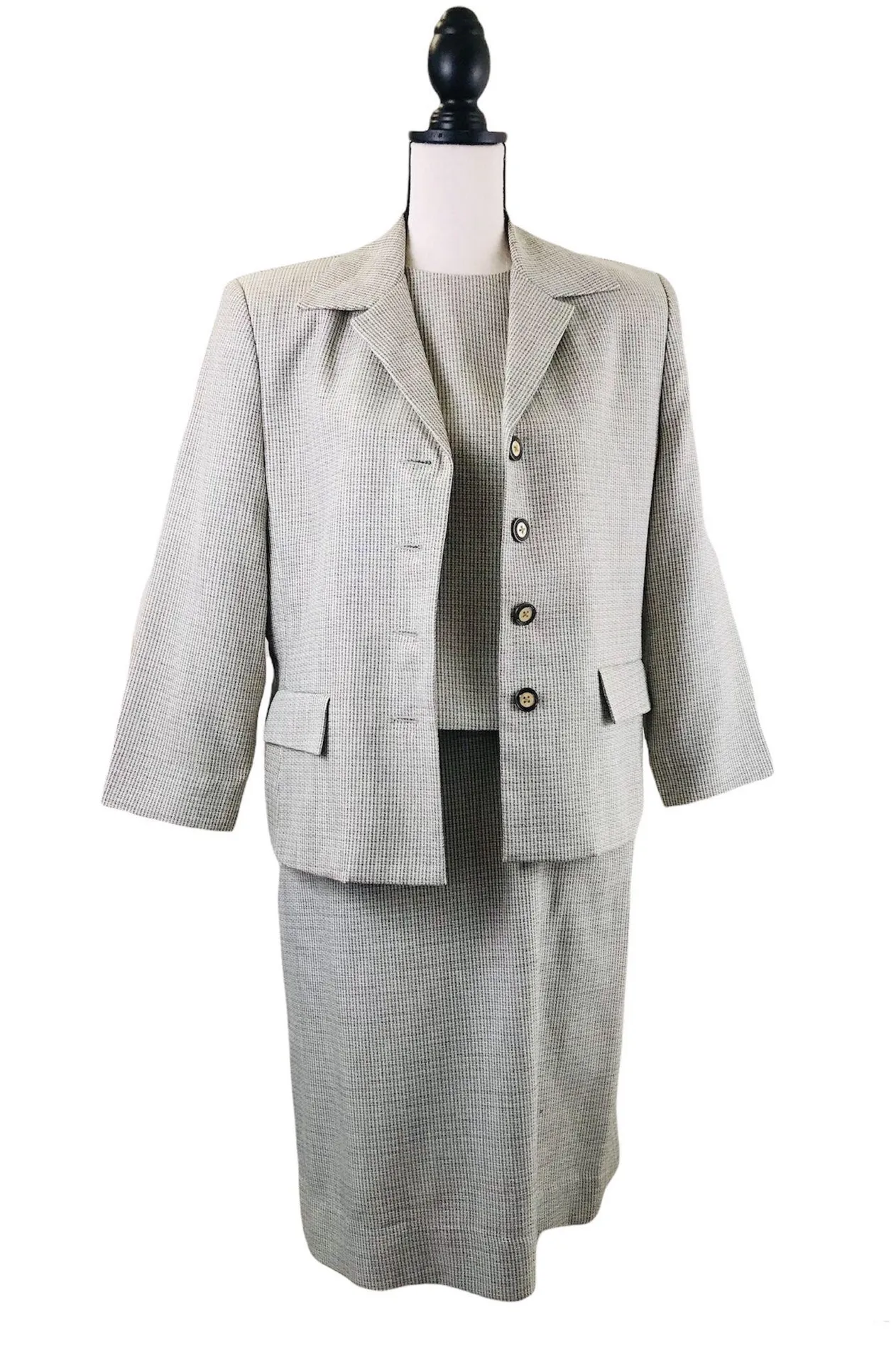 Vintage 70s Henry Lee Petites 3 Piece Beige Structured Skirt Suit Top Jacket 10P Boxy, structured shape with a small beige check pattern. Top has short sleeves, jacket is 3/4 sleeve and skirt is knee length. Excellent condition with minimal wear. Measured lying flat- Jacket 20.5” armpit to armpit 20.5” sleeves 23.5” total length Top 20” armpit to armpit 11” sleeves 20.5” total length Skirt 15” at waist 20” at hip 23.5” total length