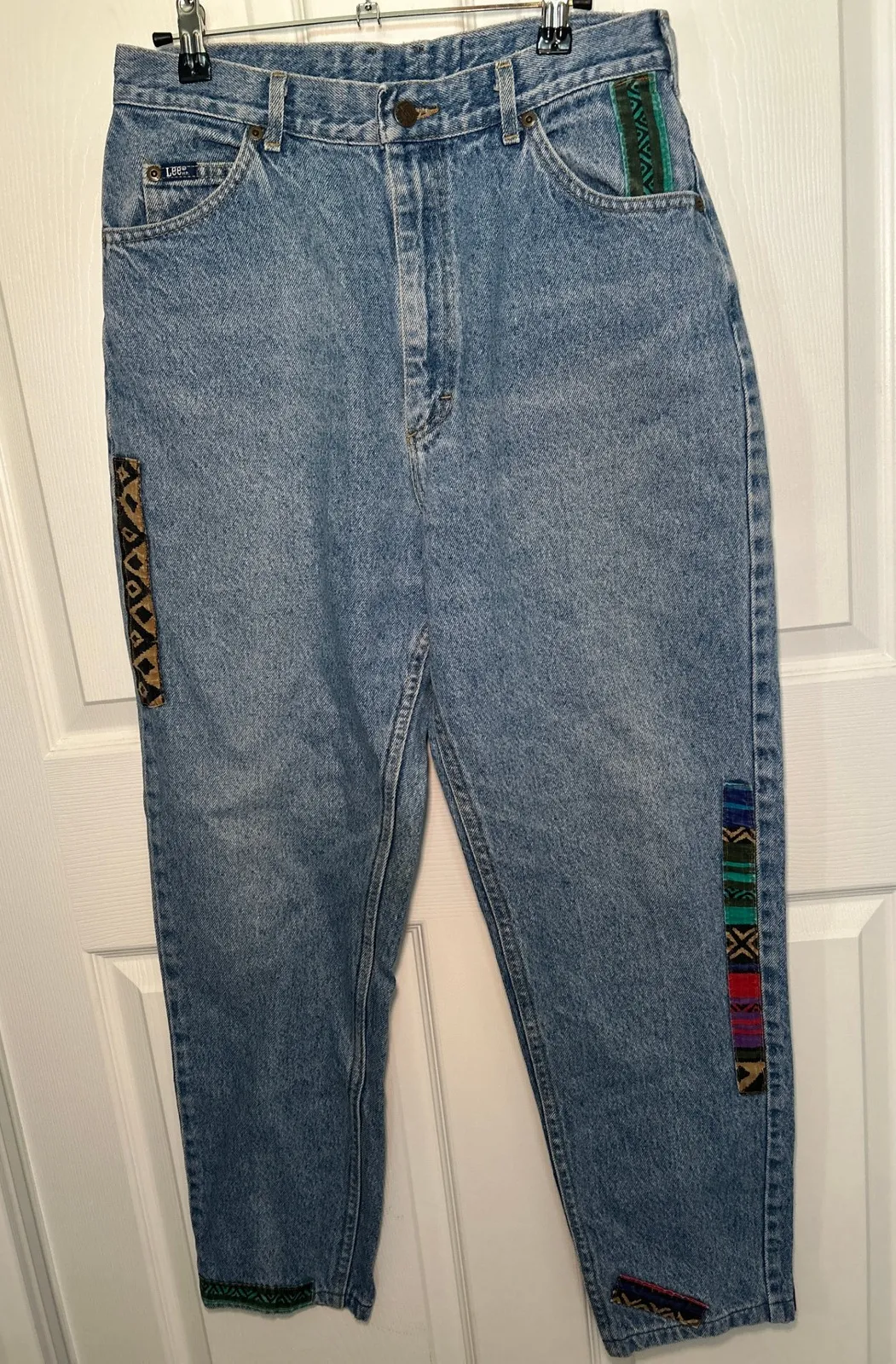 Vintage Lee mom jeans featuring a high waist and tapered leg, adorned with unique Aztec-inspired tri... Show more