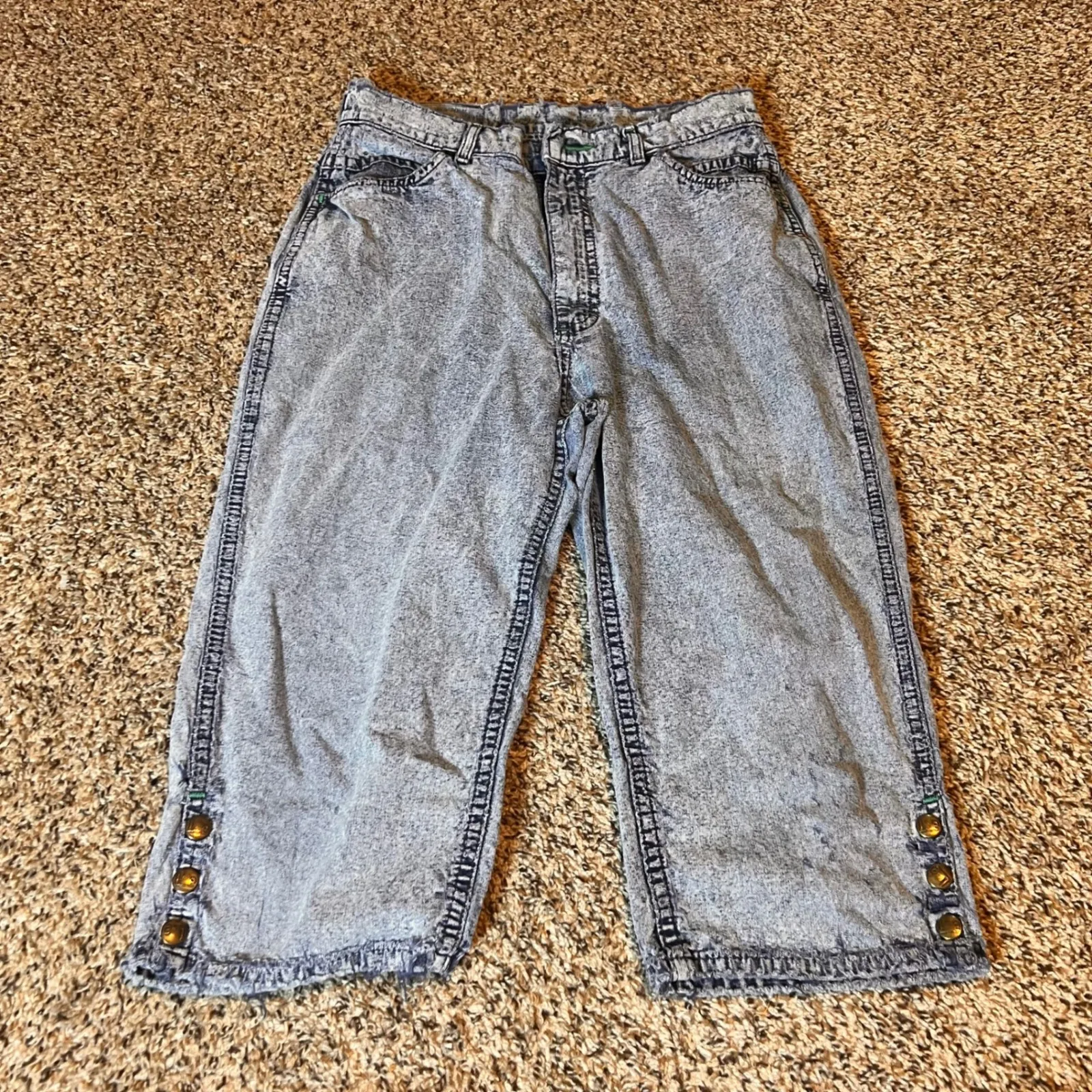 Unique vintage capri jeans, featuring an eye-catching acid wash finish. These cropped jeans offer a distinctive, retro aesthetic, perfect for adding a touch of vintage charm to your wardrobe. The wide-leg design ensures a comfortable and relaxed fit, while the button details at the hem add a stylish and unique flair. These Lee capri jeans are ideal for casual outings, weekend adventures, or adding a trendy twist to your everyday look. See photos next to buttons. Some holes next to the buttons. But these are vintage and still in good condition.